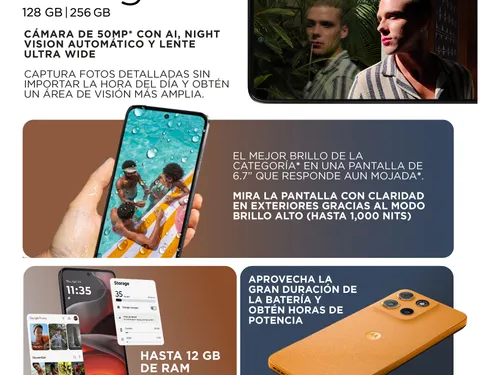 - Almacenamiento interno: 128 GB, ideal para guardar fotos, videos, música y aplicaciones sin preocuparse por el espacio.