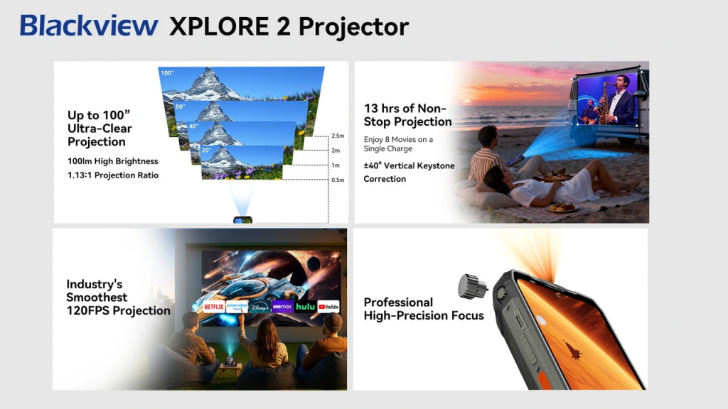 ¿Para qué cargar con un proyector externo si tu celular ya lo tiene integrado? El Blackview XPLORE 2 Projector es la evolución del mítico Max 1, pero ahora con tecnología de láser MEMS que no necesita enfoque manual. Solo lo apoyás, apuntás a una superficie plana y tenés una pantalla de hasta 100 pulgadas con una claridad asombrosa para un dispositivo de este tamaño. Es el equipo ideal para quienes buscan en las mejores rebajas en celulares una herramienta que sirva tanto para ocio como para presentaciones de trabajo.